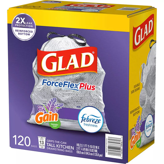 Glad ForceFlex Plus Tall Kitchen Drawstring Trash Bags, Mediterranean Lavender (13 gal., 120 ct.)