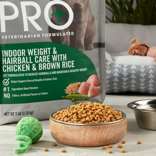 Pro+ Indoor Weight & Hairball Care Dry Cat Food, Chicken & Brown Rice, 7 lbs